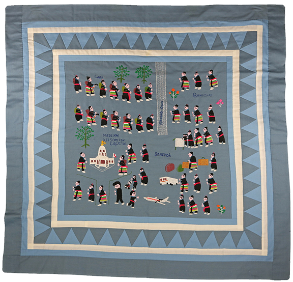 A Hmong story cloth on display at the Wisconsin Historical Museum exhibit “Hmong in Wisconsin.” This story cloth depicts the Secret War in Laos and the Hmong escape across the Mekong River. It also shows the Hmong at the Madison, Wisconsin Capitol. Made by Ge Vang.