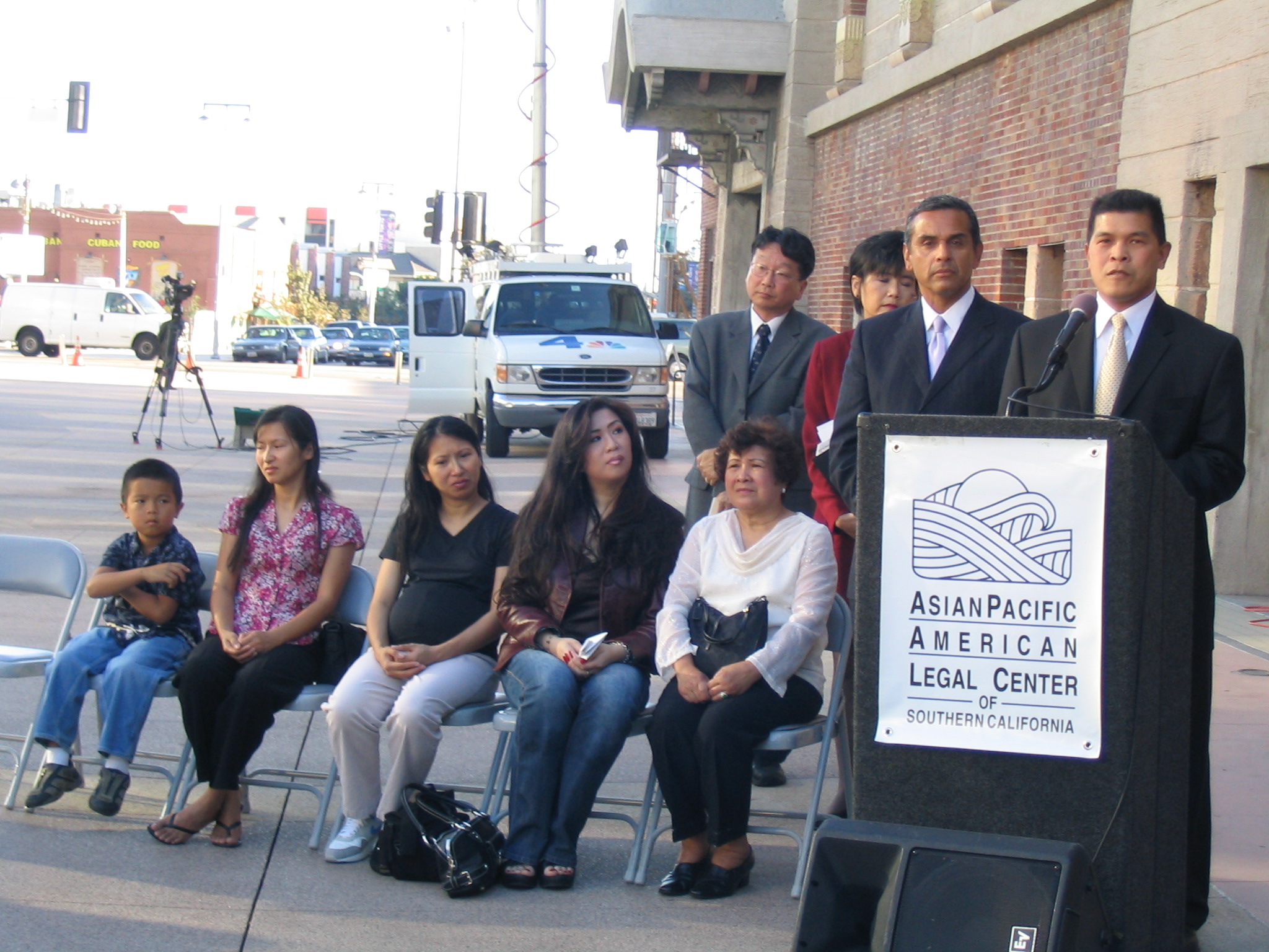 The Ileto family, seated, from left: nephew Kyle, sisters Carmina and Raquel, sister-in-law Deena and mom Lilian. Standing behind the family are, from left, Chris Komai of the Japanese American National Museum, the Hon. Judy Chu, L.A. Mayor Antonio Villaraigosa and Ismael Ileto at the APALC Commemoration Event for Joseph Ileto in August 2005.