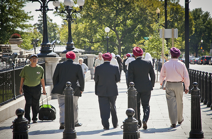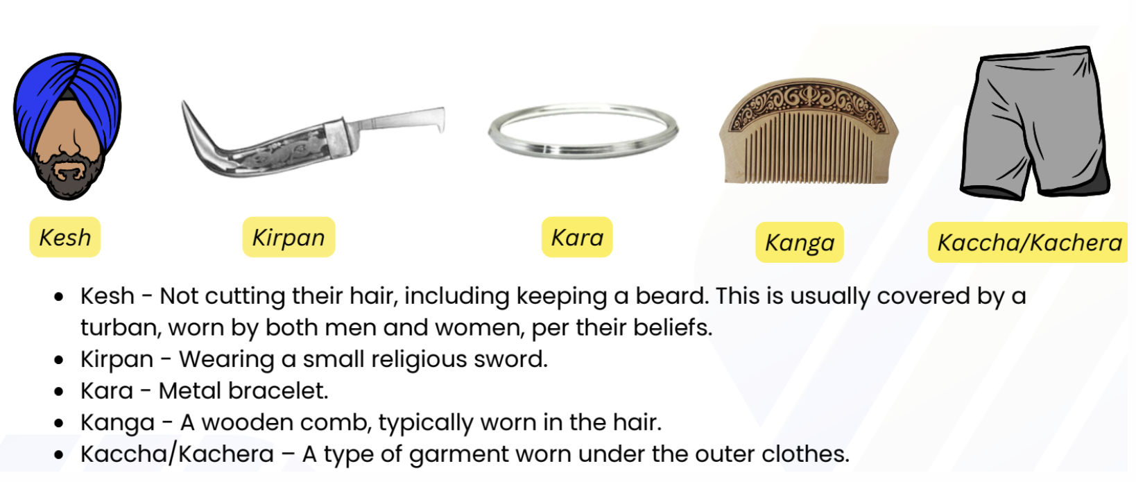 *Note: In Sikhism, there are five “articles of faith” that are worn or carried as a symbol of their faith: Kesh (uncut hair), Kirpan (religious sword), Kara (metal bracelet), Kanga (comb), Kaccha/Kachera (under-shorts). Each is worn as a symbol of their commitment to their faith.